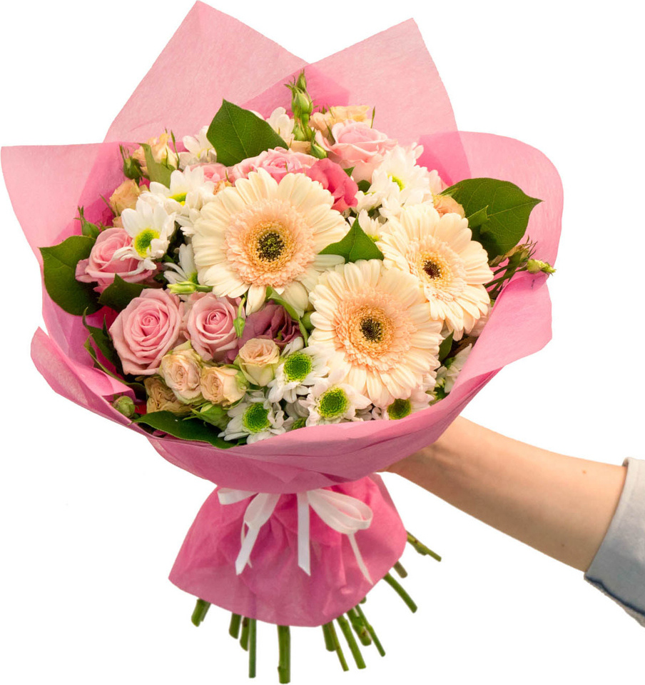 1 гербера, 1 розовая роза, 1 кустовая ромашка, 1 лизиантус, зелень, упаковка, лента2 герберы, 3 розовых роз, 2 кустовых ромашек, 1 лизиантус, зелень, упаковка, лента3 герберы, 7 розовых роз, 5 кустовых ромашек, 2 лизиантуса, зелень, упаковка, лента